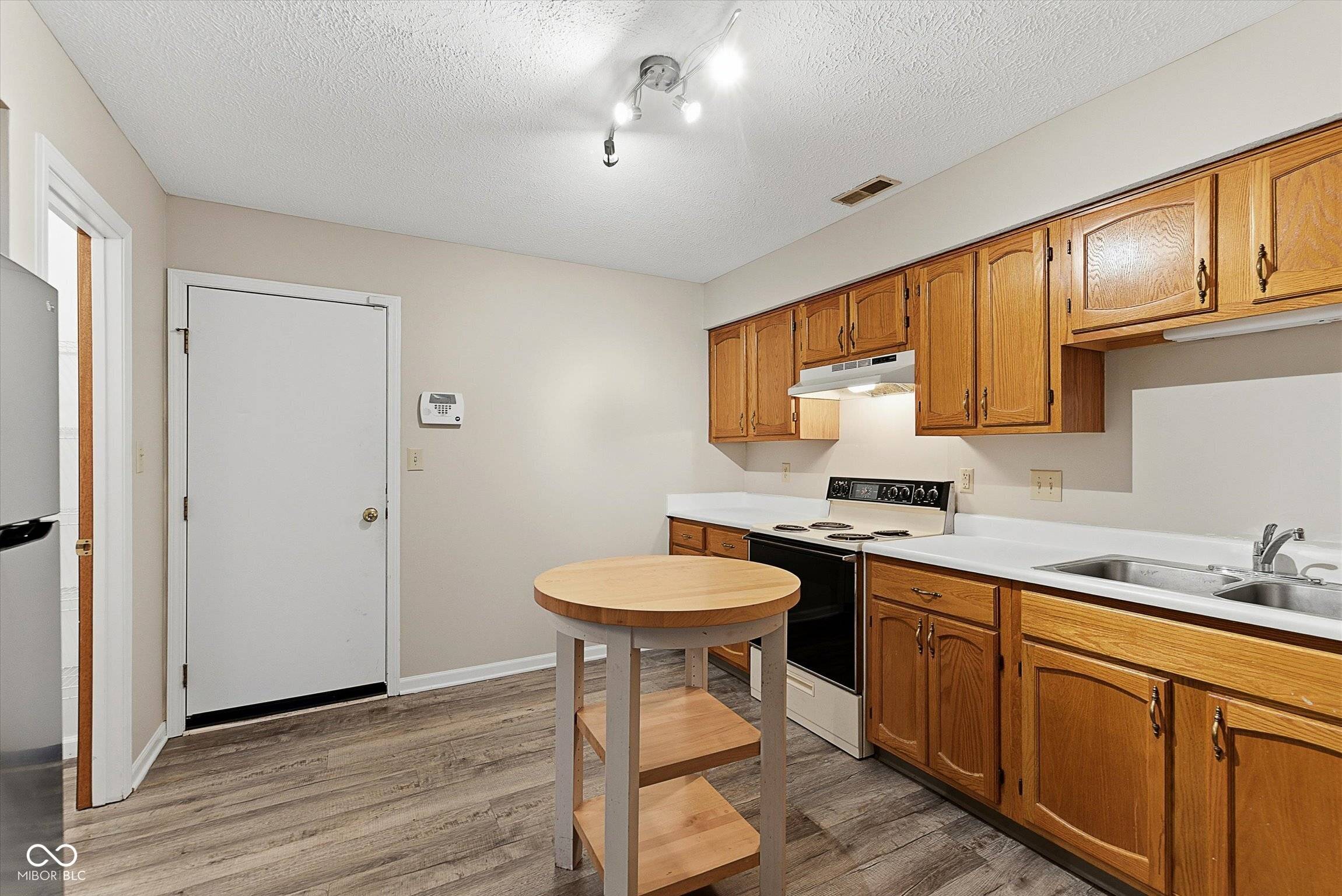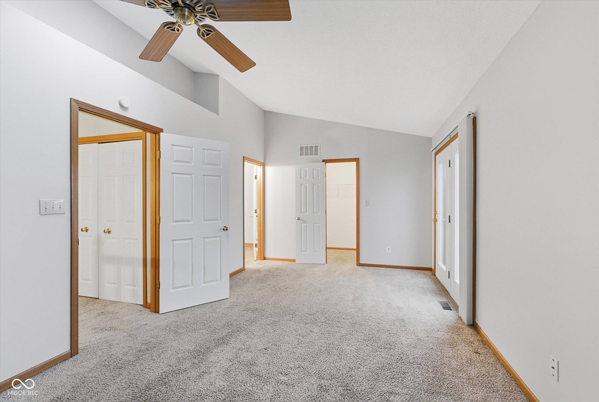 Enjoy this nicely updated 2 bed/2.5 bath condo close to Eagle Creek! Featuring two spacious bedrooms and two full baths upstairs with an additional half bath on the main level. The open concept living area is highlighted by the fireplace and leads to back deck overlooking water view. Kitchen features pantry, stainless steel fridge and dishwasher. Enjoy the easy to care for laminate hardwood flooring throughout the main level. The large primary bedroom is highlighted by a balcony with water view, full bath and walk-in closet. Natural light abounds throughout the home, while the back deck, spacious yard and attached 2-car garage seal the deal! Conveniently located near the interstate, Eagle Creek, shopping, and an easy commute downtown.